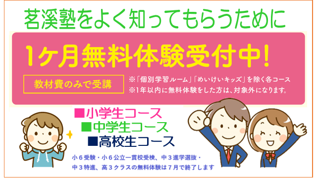 茗渓塾では、実際の指導内容や塾の雰囲気を知っていただくために、クラス授業の体験指導を行っております。 実際に体験して、ご満足いただけましたら、ぜひご入塾ください。