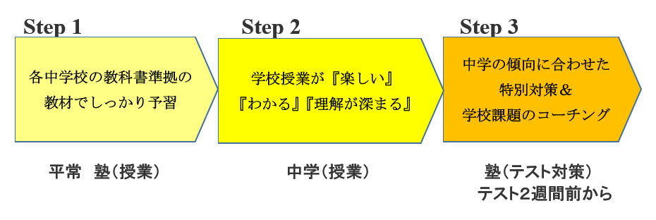 進学・選抜コースは、学校進度を先取りしながら系統的に学習を進めるコースです。学校教科書に準拠したテキストを使用して授業を行うので、塾で予習した学習内容を中学校でおさらいし、定期テスト対策で再度確認する、3ステップの効果的な学習を行うことができます。