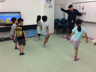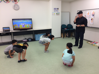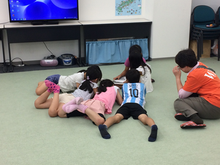 風船バレーボールをしたり、大縄跳びをしたり、思いっきり遊ぶためのスペースです。運動が苦手な子は学習スペースでボードゲームをしたり本を読んだり、工作をしたりすることも出来ます。リラックスタイムの時間帯は、基本的に大画面テレビで英語吹き替え版のアニメ(ワンピース・ドラゴンボール・ポケモン・ディズニー等)を流しています。みんなでかるたをしたり、DVD鑑賞(この場合は日本語のアニメ映画など)を鑑賞することもあります。