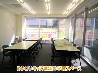 都営新宿線瑞江駅の北口を出て、1分ほどの駅前です。瑞江第一ホテルの2軒となり(ビックエコーが入っている建物の向かい側)のビルの2階です。学童専用フロアーで、楽しく快適に放課後をすごすことができます。